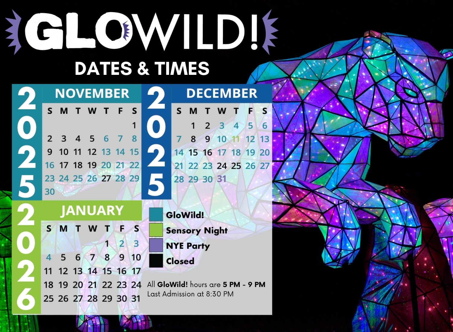 All GloWILD hours are 5:00 PM – 9:00 PM, with last admission at 8:30 PM.