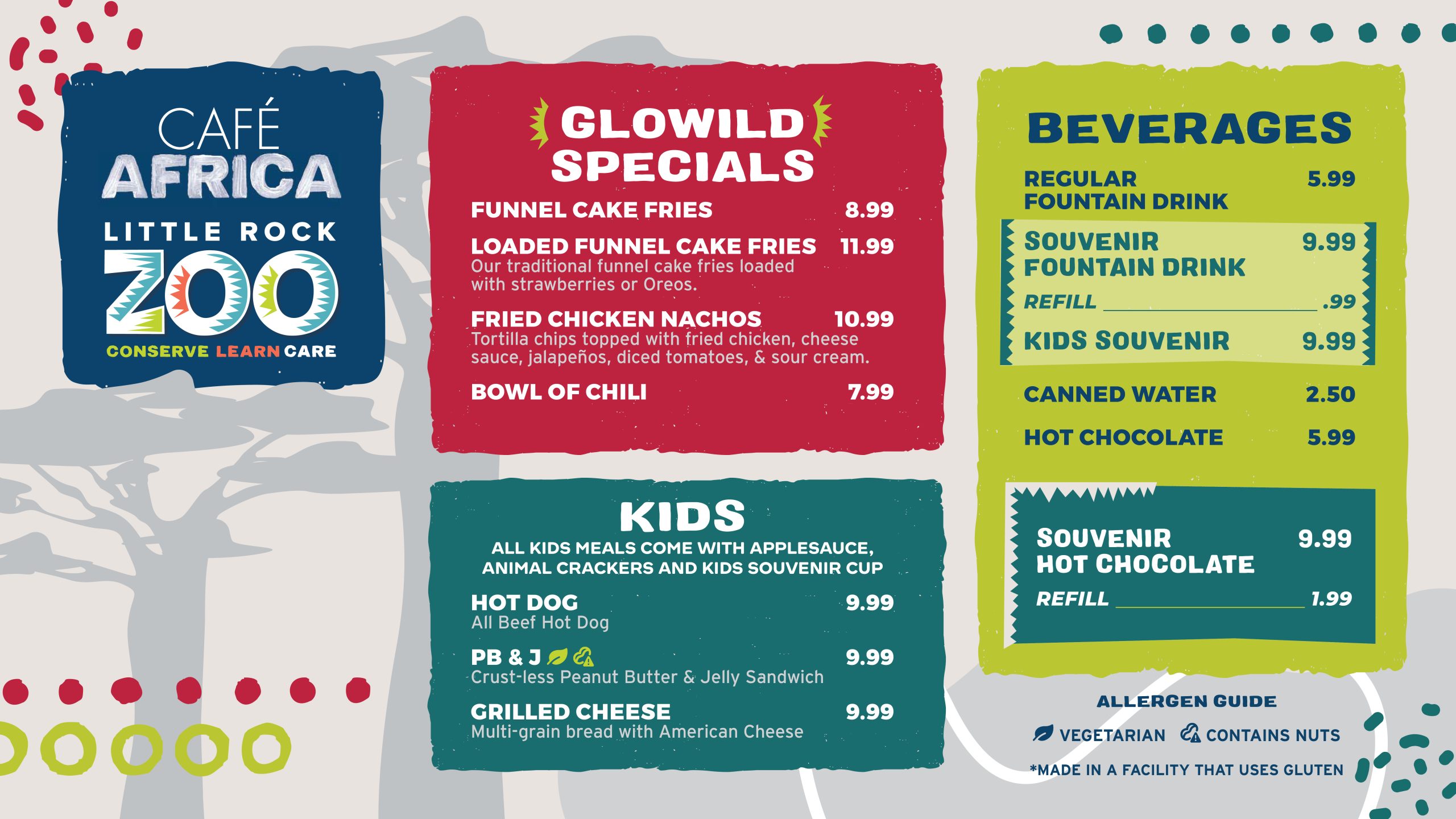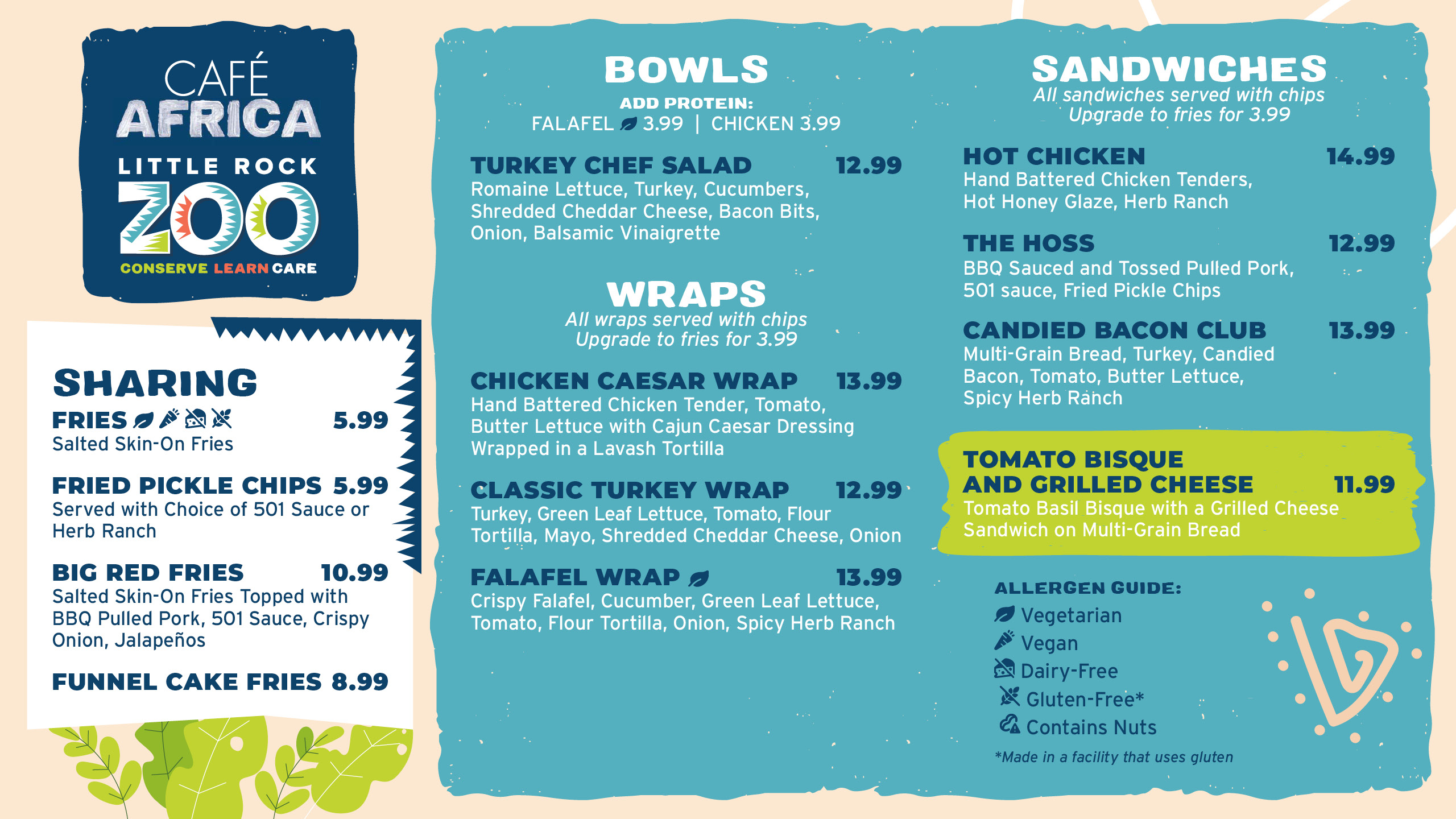 Make your visit to the Little Rock Zoo even more memorable with a stop at Café Africa. Whether you’re in the mood for a quick snack or a full meal, our diverse menu and inviting atmosphere are sure to delight.