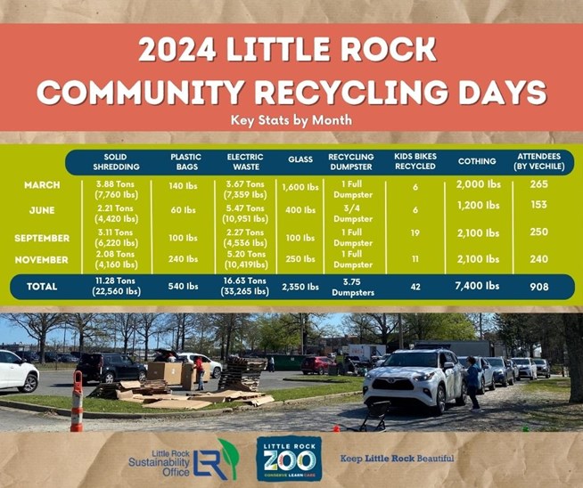 LITTLE ROCK (December 26, 2024)- The Little Rock community came together in a big way this year for our recycling events, hosted in partnership with the Sustainability Office, Keep Little Rock Beautiful, and the Little Rock Zoo. These efforts helped reduce waste, repurpose materials, and make our city a greener, cleaner place to live. Here’s a look at the incredible impact you made:
